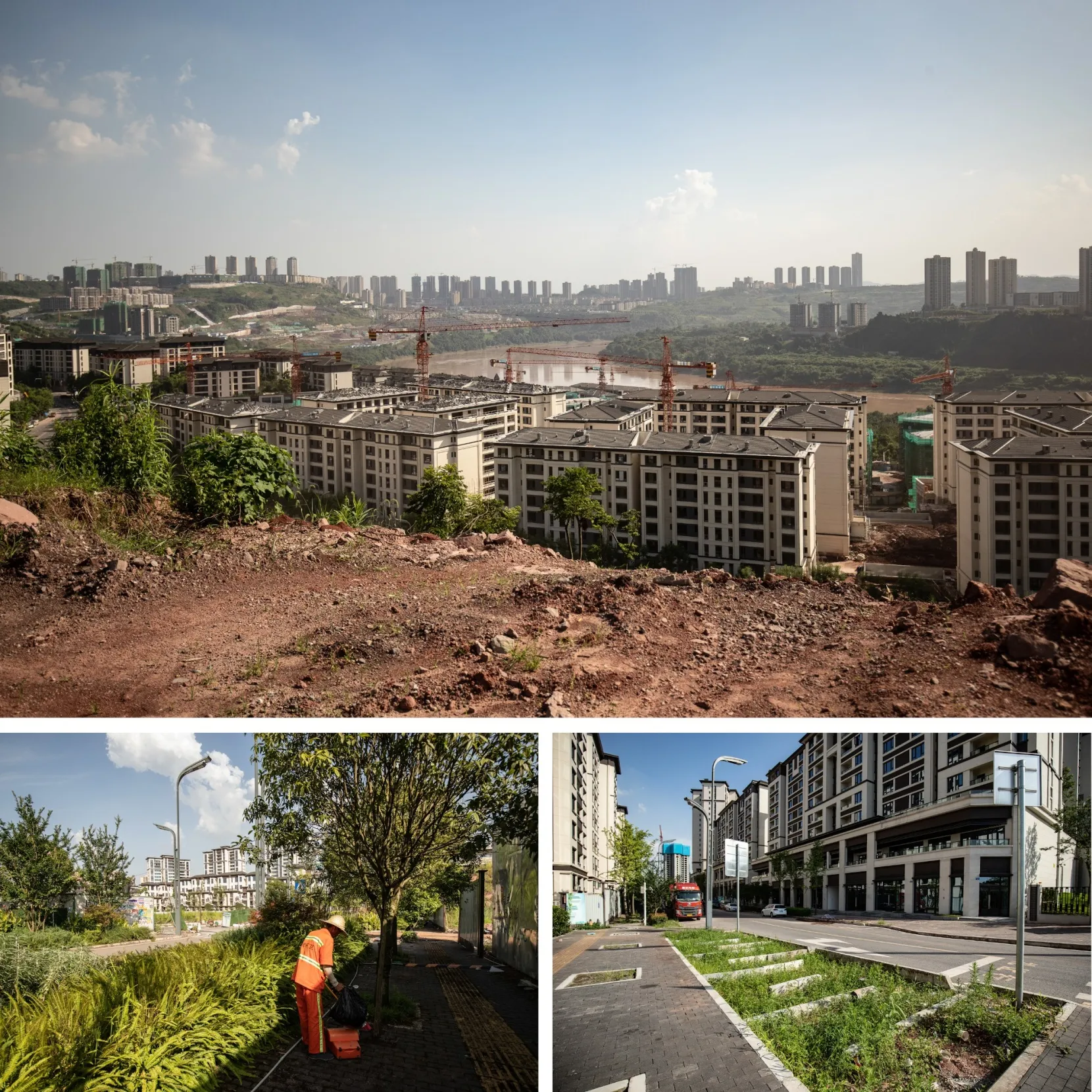 顶部:悦来新城周围的新建筑。底部:悦居路两侧的蓄水区。摄影师:沈其来/彭博社“开发商砍伐森林,破坏草地,建造房屋,然后种植装饰性树木,使其成为‘海绵城市’,他们赚了一大笔钱,”重庆的出租车司机左说,他只愿意提供姓氏。