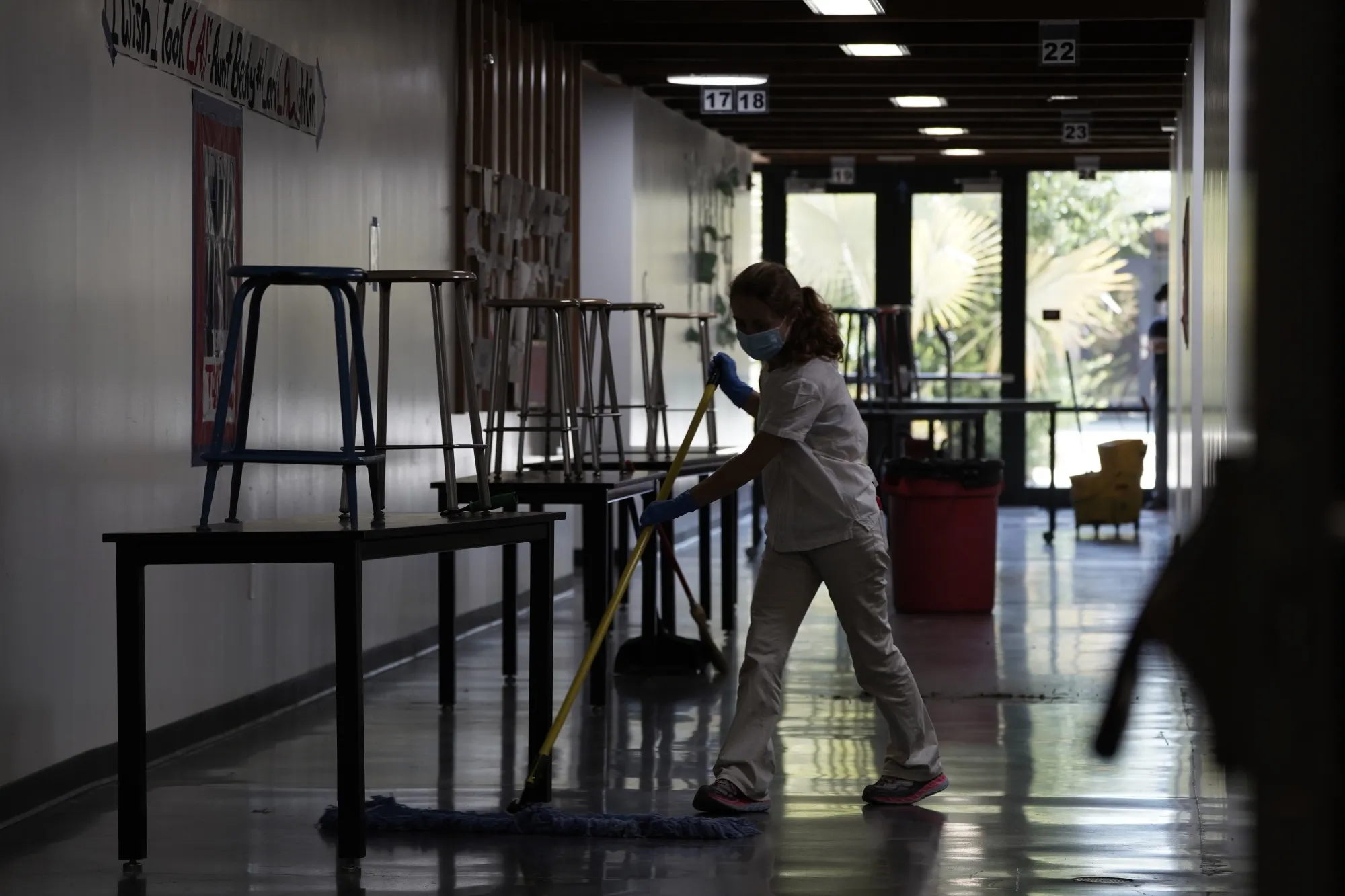 一名维护工人在加利福尼亚州圣地亚哥的托雷派恩斯高中清洁走廊地板,时间是7月10日。摄影师:宾·关/彭博社更多压力 | 美国对德国和法国施加了额外关税,针对他们的一些商品,此举旨在迫使欧盟解决对空客的非法补贴争端。该公告延长了对美国企业和消费者的进口税负担,同时在全球经济试图从病毒引发的衰退中恢复之际,加大了对跨大西洋盟友的压力。