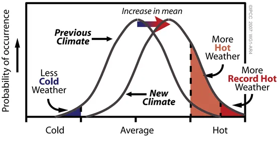 来源:联合国气候变化政府间专门委员会我们看到如此多的创纪录高温,正是因为全球平均温度现在已经上升了超过1°C。这些相对较小的平均温度上升不仅仅使炎热天气变得更可能。它们大大增加了极端炎热天气的机会。增加更多温度变异性,极端天气的机会还会更高。