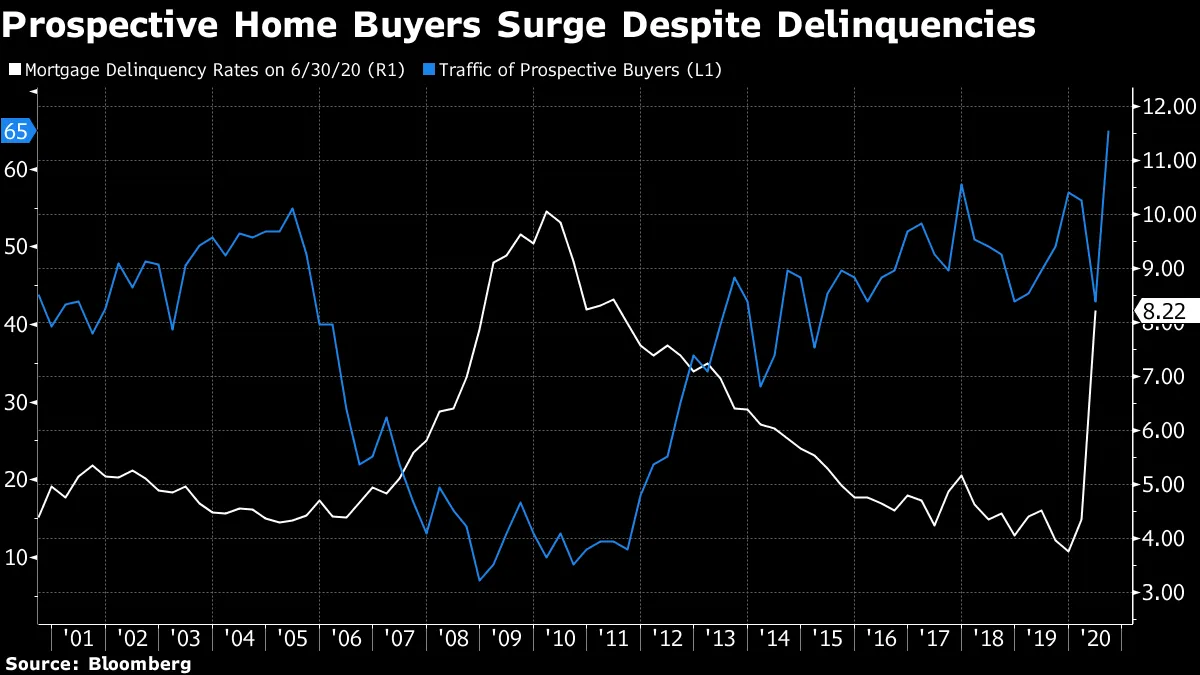 Covid-19引发的经济危机的一个显著特征是,它的表现方式因人而异。例如,在资本市场,大公司能够向渴望的投资者出售大量债务,而小公司则在融资方面苦苦挣扎。但到处都有迹象。如果你有幸被雇佣并且有一些储蓄,那么你可能一直在浏览房地产列表,希望能找到一个便宜的交易——过夜的数据表明美国住房开工量激增,是自2016年以来的最大增幅。但如果你被解雇并且没有多少现金缓冲,那么你可能在努力偿还抵押贷款。尽管越来越多的人表示有兴趣购买房屋,但拖欠情况仍在激增,正如我在彭博社的同事Dan Curtis下面的图表所示。同样,如果你通过退休计划或私人投资组合接触到美国股票,你可能会对市场创下历史新高感到一些安慰。如果没有,那么市场可能与真实经济相去甚远。