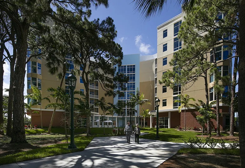 佛罗里达州庞帕诺海滩的约翰·诺克斯村拥有一个围绕绿色房屋原则设计的护理住宅:六层建筑的每一层都有一对12人的“家”。照片由绿色房屋项目提供建筑团队的Vivirito认为,老年护理的未来将更加注重服务,以便让人们能够在家中待得更久。这与绝大多数老年美国人的退休后愿望相符——根据AARP的说法,大约90%的人表示他们更喜欢在家中老去。不难得出结论,改善护理院的最佳方法可能是完全避免它们,通过向希望尽可能长时间留在家中的老年人提供更多服务和资源。但在家老去也面临着自身的挑战,即高成本、训练有素的护理人员严重短缺(行业代表表示国家正处于“危机边缘”),以及“通用设计”升级的不足,这些升级有助于老年人留在家中(在2011年,最新数据可用时,仅有3.5%的美国住房具有基本的无障碍特征)。