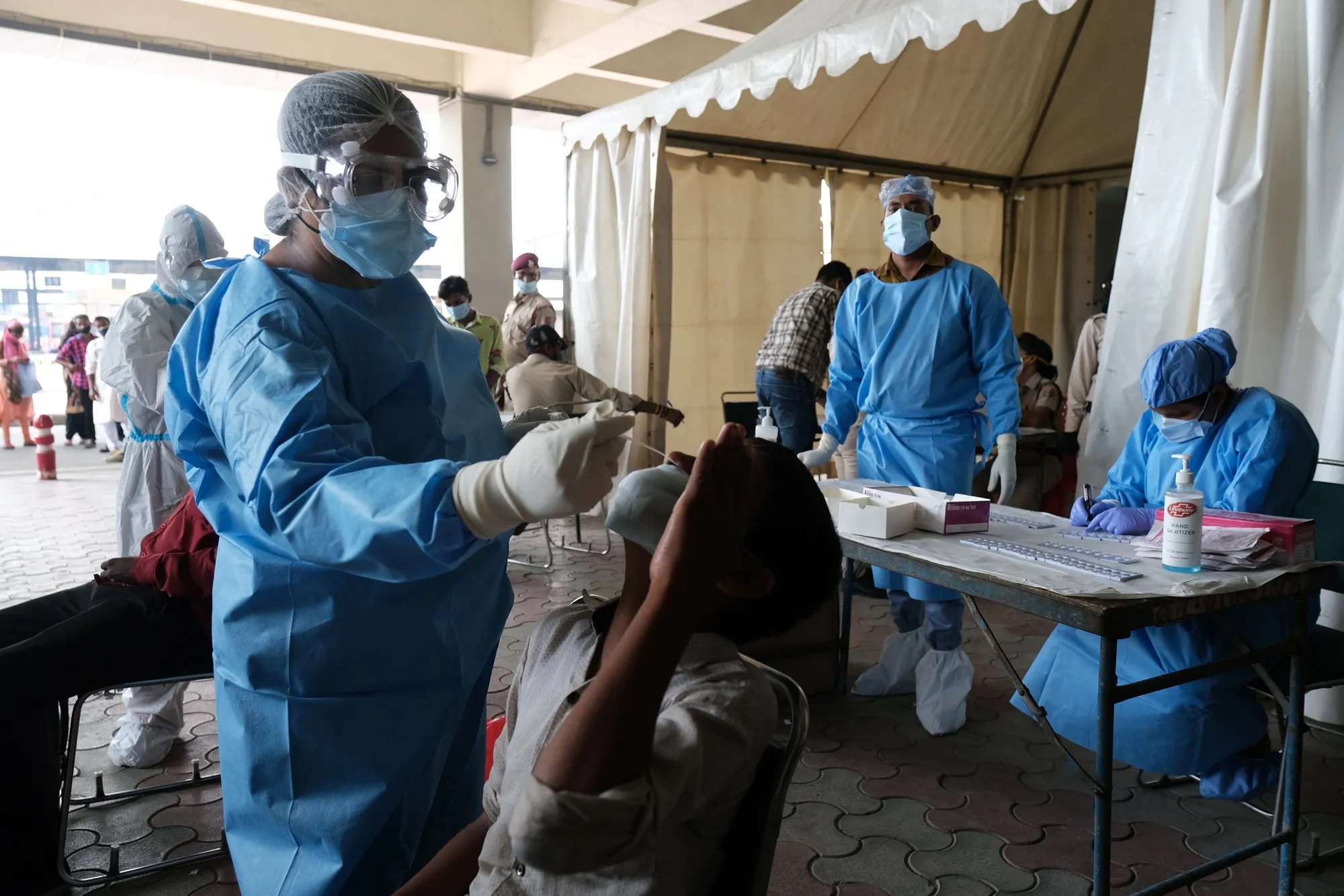 一名医疗工作者在印度新德里的一处临时设施中为一名 migrant 工人收集 Covid-19 快速抗原检测的拭子样本,时间是周二。摄影师:T. Narayan/彭博社与瑞典不同,瑞典采取了一种放任自流的方式,一些人认为这相当于试图创造群体免疫,而这一现象似乎在印度是无意中发生的。该国在五月实施了严格的封锁,但其城市贫民的生活条件,往往居住在拥挤的贫民窟,可能为病毒传播提供了过于理想的环境。
