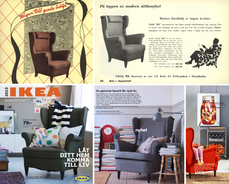 世界各地的翼椅:顶部是1951年的目录,展示了MK椅子。同样的椅子在2013年和2014年的目录中重新出现。Inter IKEA Systems B.V.业务迅速起飞:客户可以通过电话或邮寄方式提交订单,返回目录中包含的优惠券。从1958年开始,他们可以到瑞典阿尔姆赫特的第一家IKEA商店,带着自己选择的商品回家。“家具超市”的概念是IKEA成功的一部分。但自己动手组装并不是最初的想法。“起初,都是已经组装好的产品,”斯文森说。“但很早我们就尝试通过拆掉桌子的腿来进行实验。”平板包装的诞生可以追溯到一位员工,他开始拆卸LOVET桌子的腿,以安全地将其装入客户的后备箱。