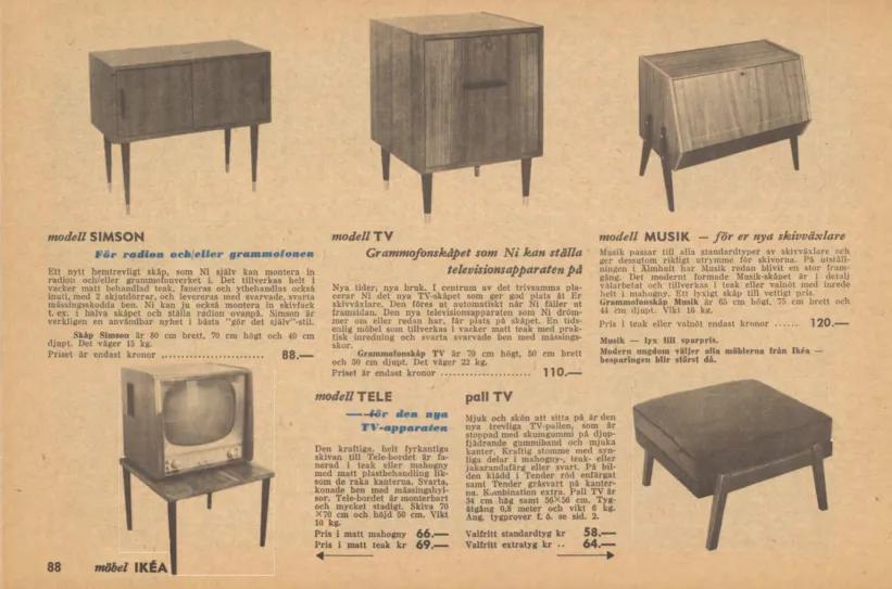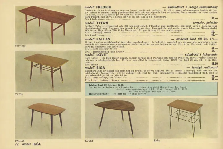 1962年目录中的一页展示了LOVET桌子(底部,中间图片),它于1956年首次亮相。Inter IKEA Systems B.V.早期的目录相对实用;直到1960年代末和70年代,五颜六色的塑料和奇特的面料出现,照片开始展示家具在样板居住环境中的摆放,这些环境至今仍然看起来很吸引人。
