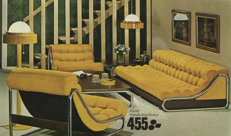1973年目录中的Impala系列沙发和椅子。宜家系统有限公司。目录中的插图也作为家庭技术的时间线。第一台电视在1958年的第88页出现,随后新设备迅速增多并开始主导家庭;娱乐中心的大小逐渐增加,客厅沙发和扶手椅的朝向也逐渐改变,从面对面转向指向电视屏幕。