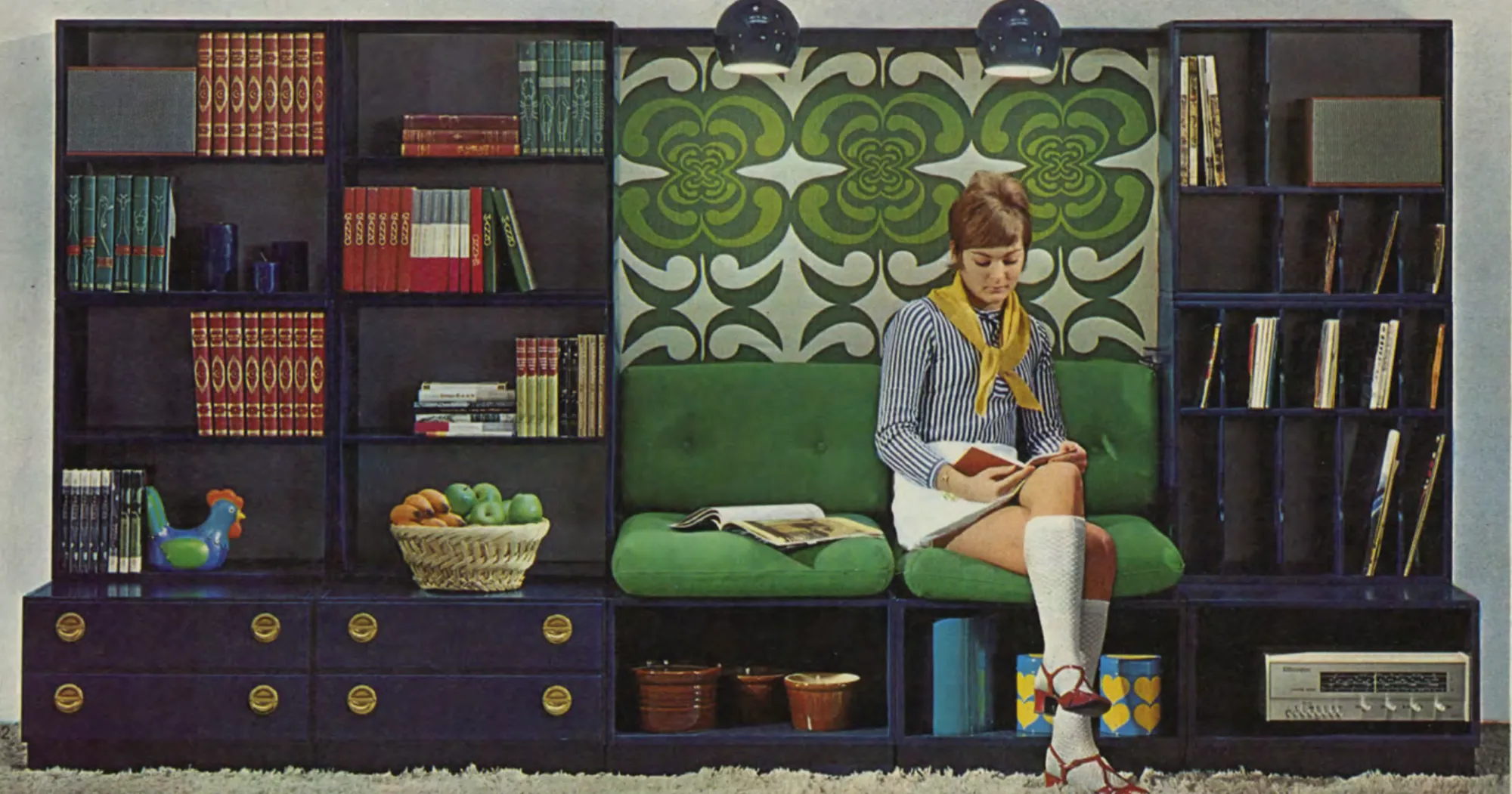 一个非常现代的阅读角落,来自1971年的目录。宜家系统有限公司。看看这个1973年的太空时代客厅。