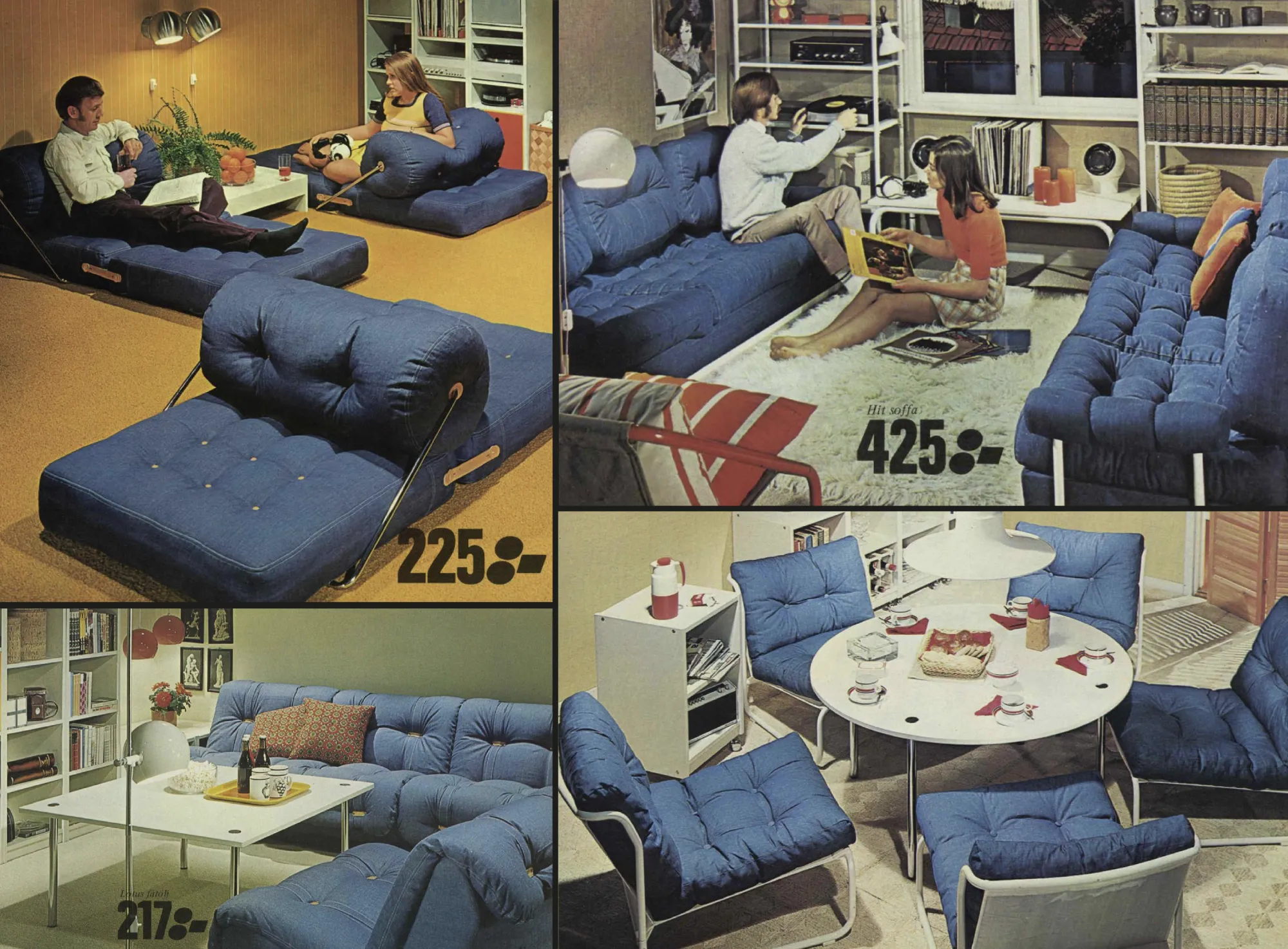 1958年,电视出现,电视架也随之而来。宜家系统有限公司。该公司于1973年在瑞士斯普雷滕巴赫开设了第一家位于斯堪的纳维亚以外的商店。国际扩张是公司品牌塑造的一个转折点:其瑞典根基成为品牌身份的基础,使宜家成为瑞典软实力的工具。走向全球意味着“瑞典化”品牌,设计历史学家Sara Kristoffersson在她的公司文化历史中写道,设计来自宜家。公司的图标和设计感最终与瑞典本身同义。她讲述了一个西班牙足球迷在2012年欧洲杯问道:“为什么瑞典队由宜家赞助?”的故事:“瑞典队的蓝黄球衣显然引发了与宜家而非瑞典国旗的联想。”1973年瑞典目录的封面展示了TAJT椅子,一种用牛仔布覆盖的可折叠榻榻米。除了是国际扩张的一年,73年也是牛仔布的一个重要年份。