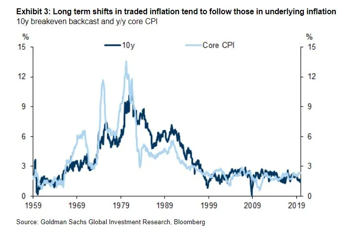 与此同时,高盛的利率策略师们构建了一个从1950年代开始的长期市场隐含通胀预期估计。它显示,通胀预期需要很长时间才能真正转变,通常只有在官方通胀率已经变化之后才会发生。正如他们总结的:“通胀预期(及其行为)的结构性变化往往需要时间,并且通常需要基础通胀呈现类似模式。总体而言,这表明,对于美联储的新框架要对通胀市场及其行为产生实质性影响,市场将需要时间和证据来证明美联储对更高通胀的宽容。”市场对更高通胀的反应速度——如果有的话——可能比审查结果本身更有趣。