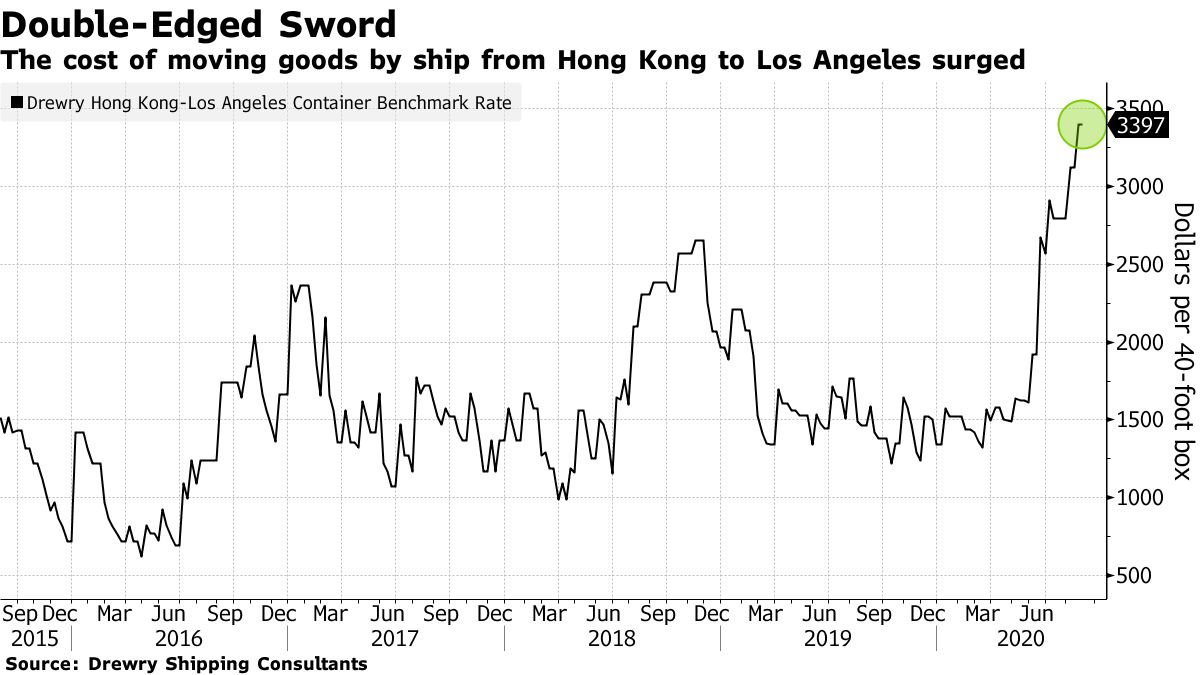 这已经转化为不断增加的海运货物运输成本,其中一个基准的跨太平洋集装箱运费自5月底以来翻了一番,创下新高。散货船的成本也从四年来的低点反弹。马士基在4月份闲置了约20%的运力,随后逐渐恢复,部分原因是运费改善使得收益超出预期。