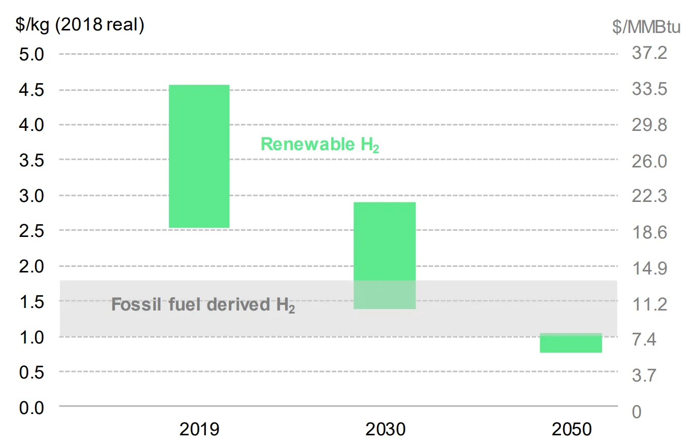 BNEF对绿色氢气生产成本的预测,与从天然气中提取的氢气相比。