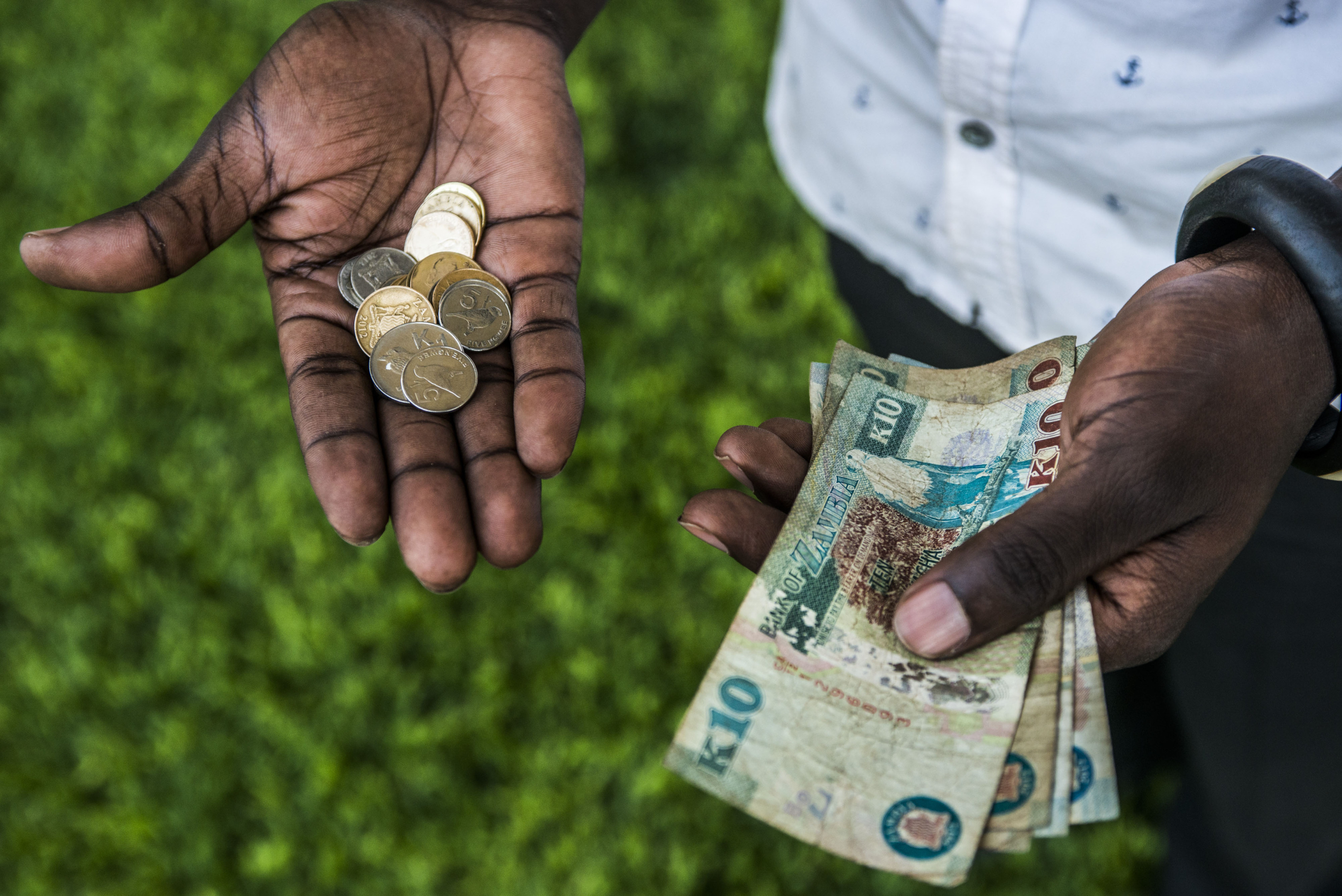 一名男子手持赞比亚克瓦查纸币和恩戈韦硬币。