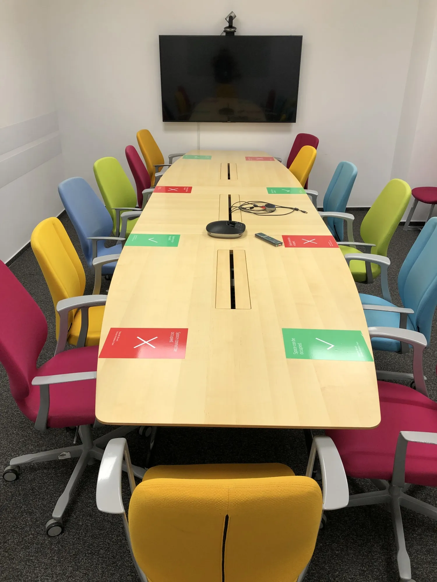 会议室的距离标记,不仅标明人们应该坐的位置(绿色),还标明不应该坐的位置(红色)。创世纪地产根据房地产经纪公司Avison Young的最新研究,今年上半年全球对办公空间的需求暴跌,这是近年来最大规模的居家办公活动。在罗马尼亚首都,随着疫情的爆发,需求同比下降了45%。在新冠病毒传播到东欧之前,布加勒斯特为该地区的办公空间提供了最丰厚的收益。图多尔和他的同事们希望更全面的安全标准能够缓解人们重返办公室的恐惧。