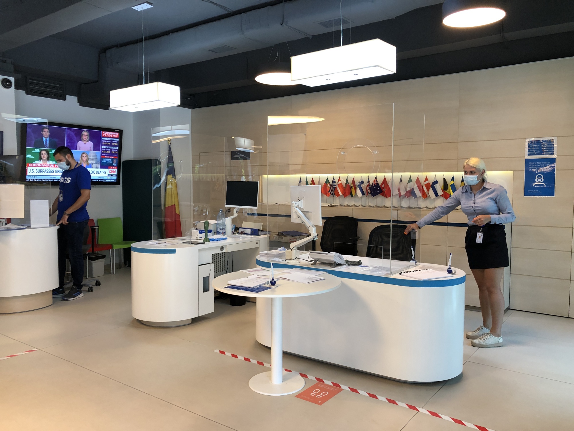 位于罗马尼亚布加勒斯特的爱立信办公室的接待台,该空间正在被改造为新的“免疫”建筑标准的试点。