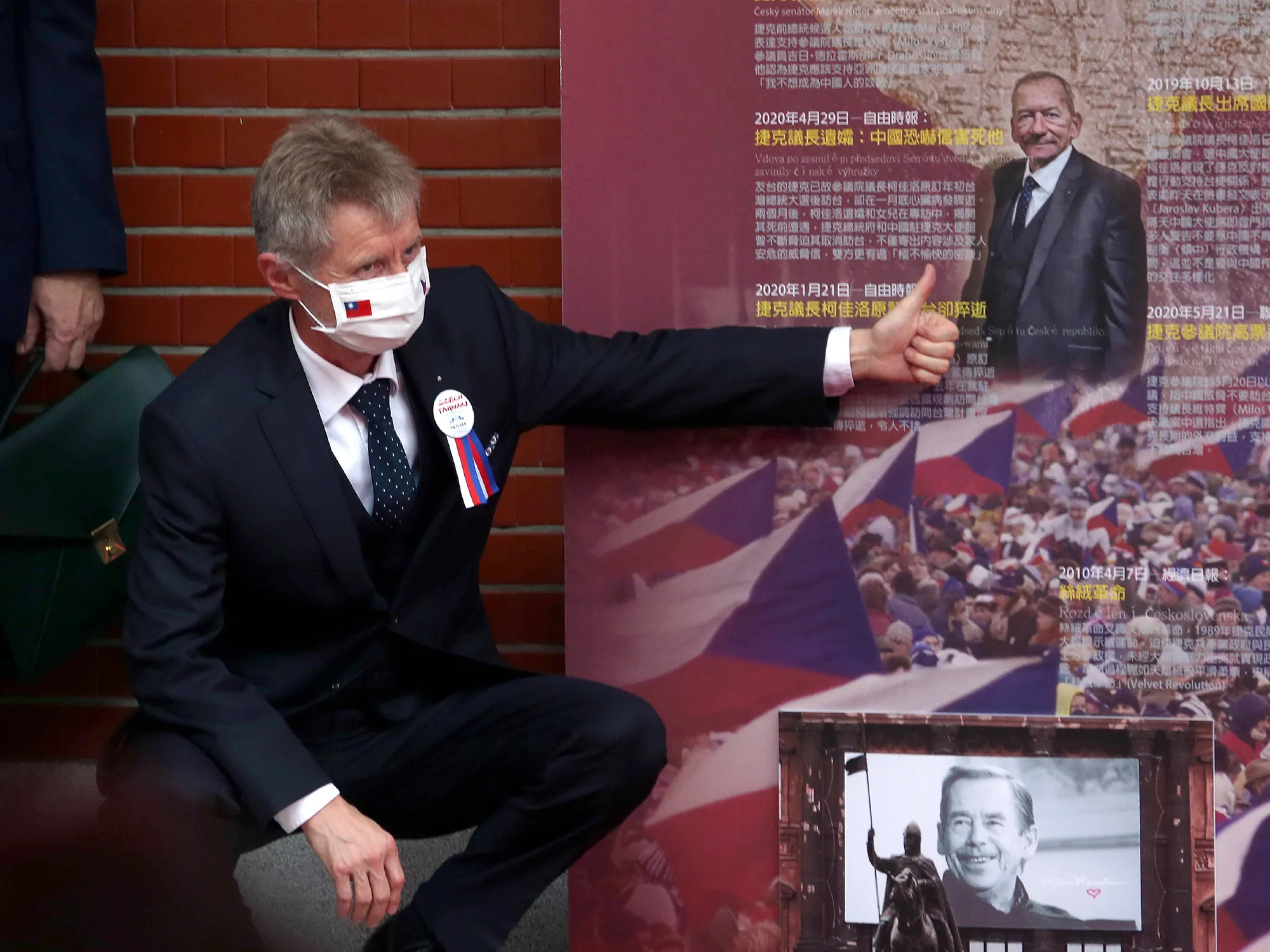 维斯特里奇在九月一日于台北立法院发表演讲后,向已故捷克参议院发言人雅罗斯拉夫·库贝拉的形象竖起大拇指。摄影师:蒋英英/AP### 关注事项
