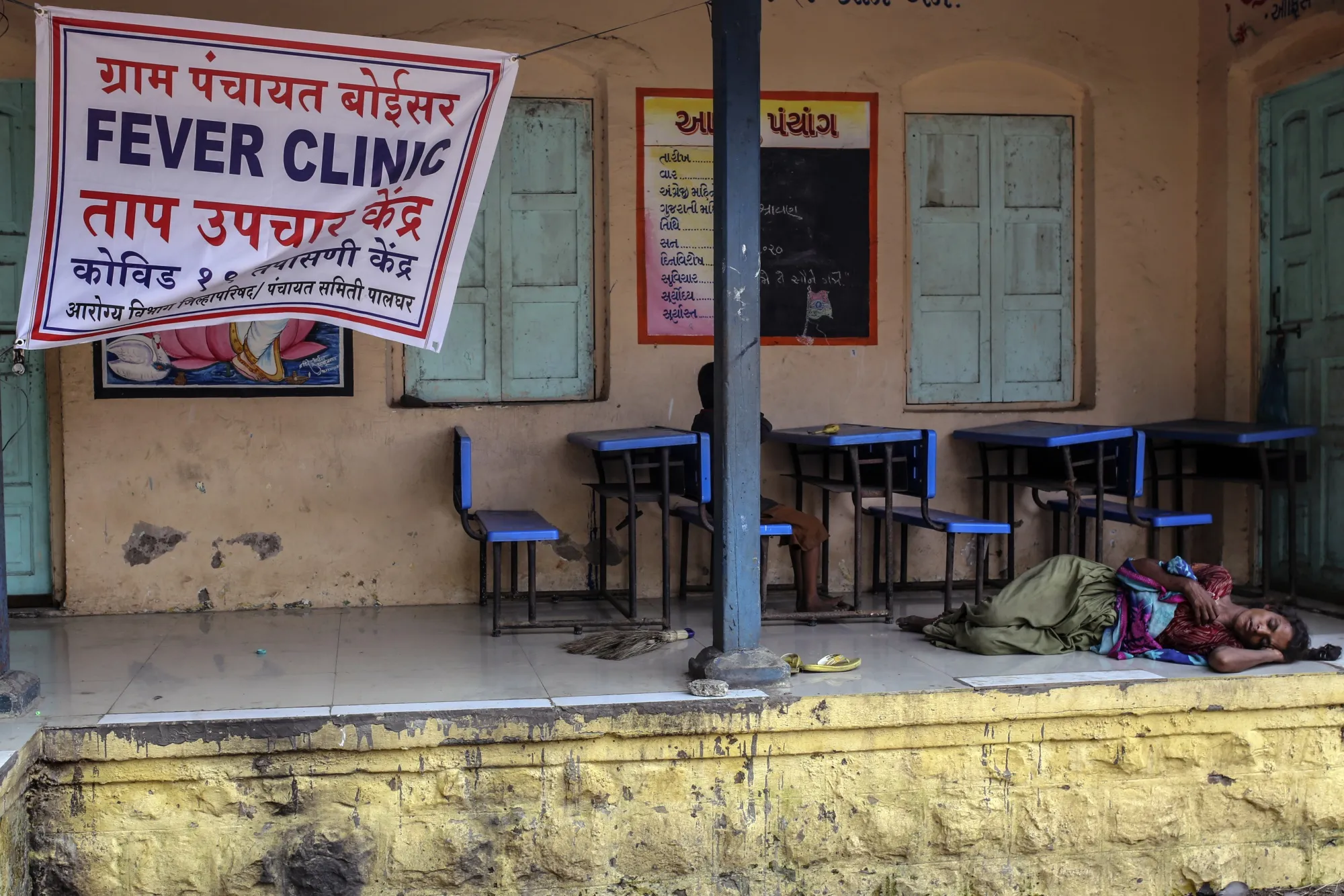 一名女性在印度博伊萨尔的一个村委会办公室外的封闭发热诊所外睡觉,时间是9月6日。摄影师:迪拉杰·辛格/彭博社