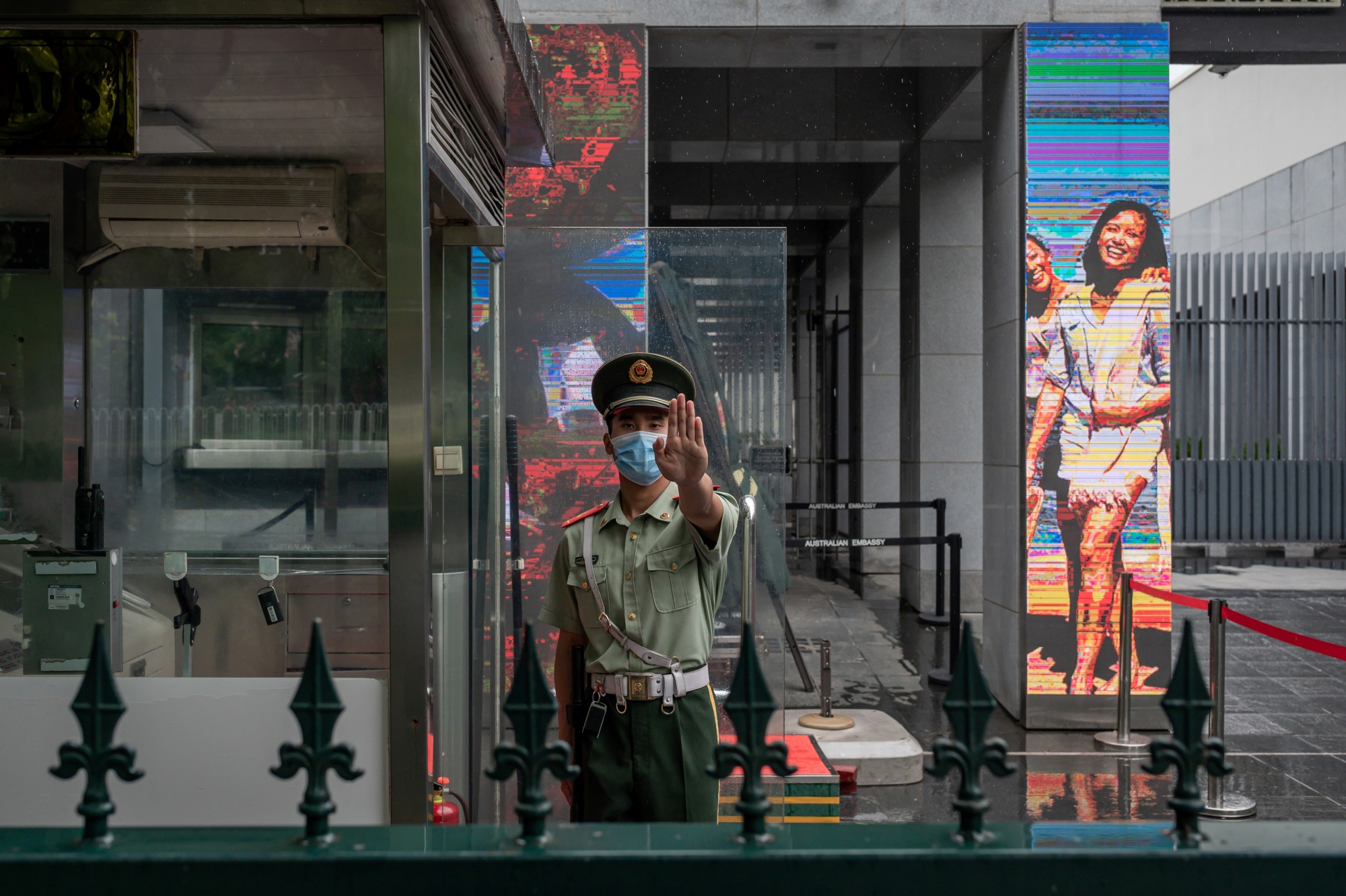 一名中国准军事警察在7月9日站在北京澳大利亚大使馆的入口处做手势。