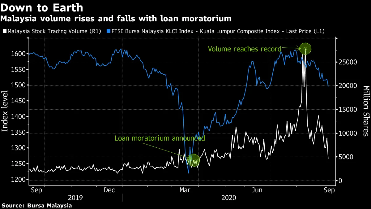 美国并不是唯一面临罗宾汉问题的国家。马来西亚也见证了一大批散户交易者进入股市——这要归功于为期六个月的贷款还款宽限期,而不是以虚构的英国歹徒命名的免费交易应用程序。虽然美国市场正在处理业余投资者涉足期权的后果,但在马来西亚,新手们推动了创纪录的常规交易量,而这一趋势现在即将结束,正如我的同事Yantoultra Ngui周三指出的那样。
