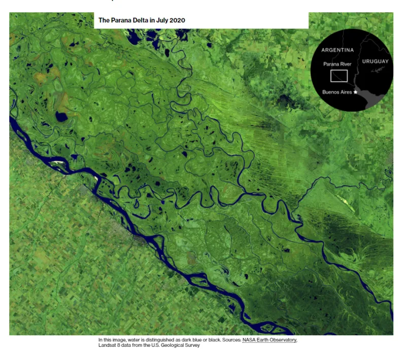 *南美洲的巴拉那河水位,**是阿根廷200亿美元农作物出口部门的主要出口路线,*目前处于50年来的最低水平。在四月份,水位在该国粮食交易中心罗萨里奥仅为78厘米(31英寸);在五月,一艘载有大豆的船只在一周内搁浅两次,导致航行中断数天。疏浚这条河流的费用将达到38亿美元,这是一个为期15年的项目,旨在保护这一贸易路线。