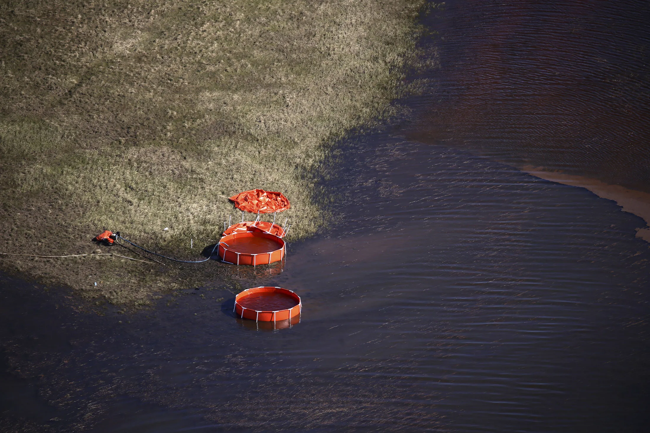 泄漏从太空可见,卫星捕捉到一条红色污渍沿着附近的安巴尔纳亚河向北移动。