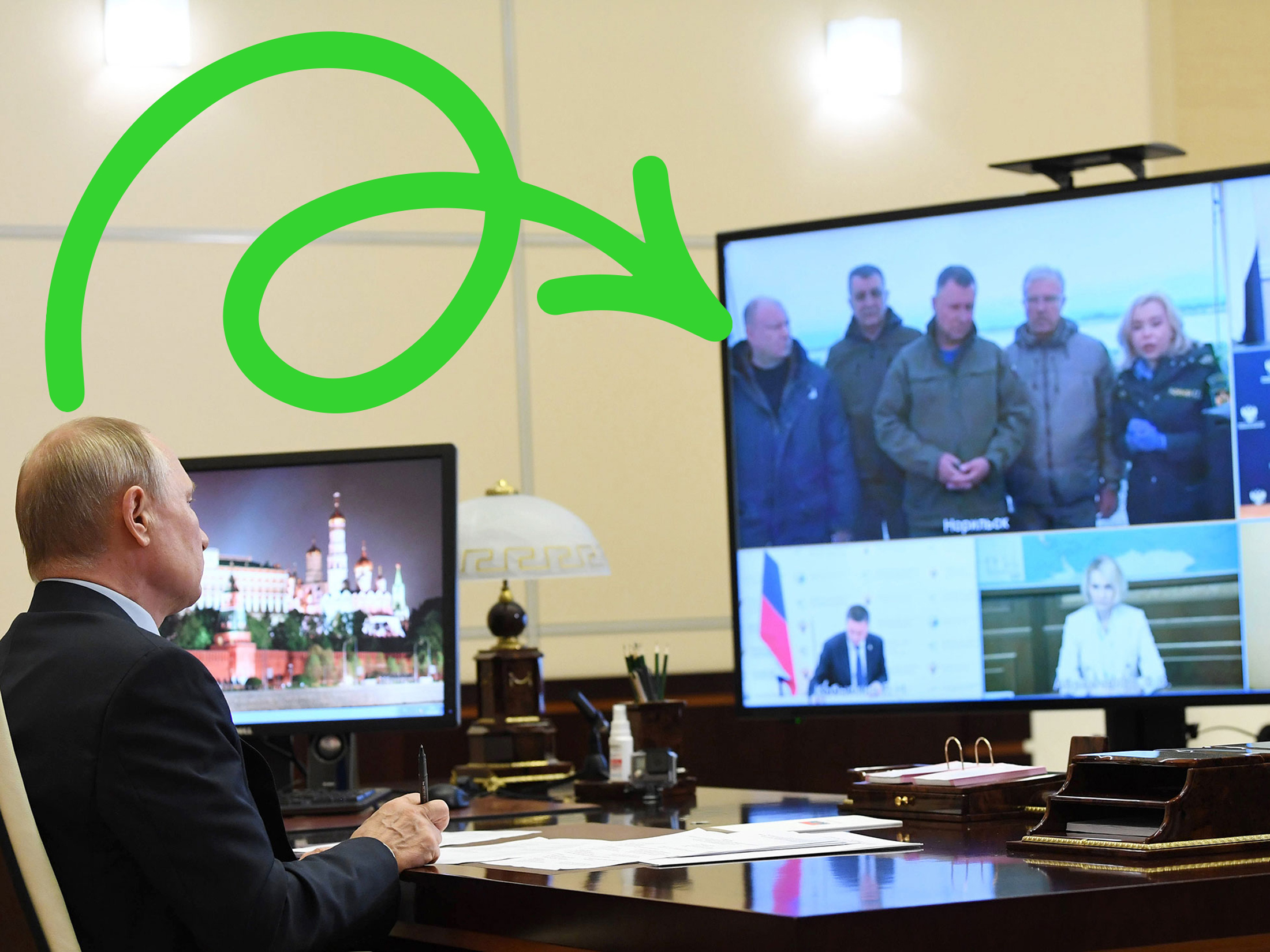 弗拉基米尔·波塔宁,左侧屏幕上,6月5日受到俄罗斯总统弗拉基米尔·普京的公开斥责。此次广播是在他的矿业公司诺里尔斯克(Nornickel)向北极泄漏柴油的几天后进行的。