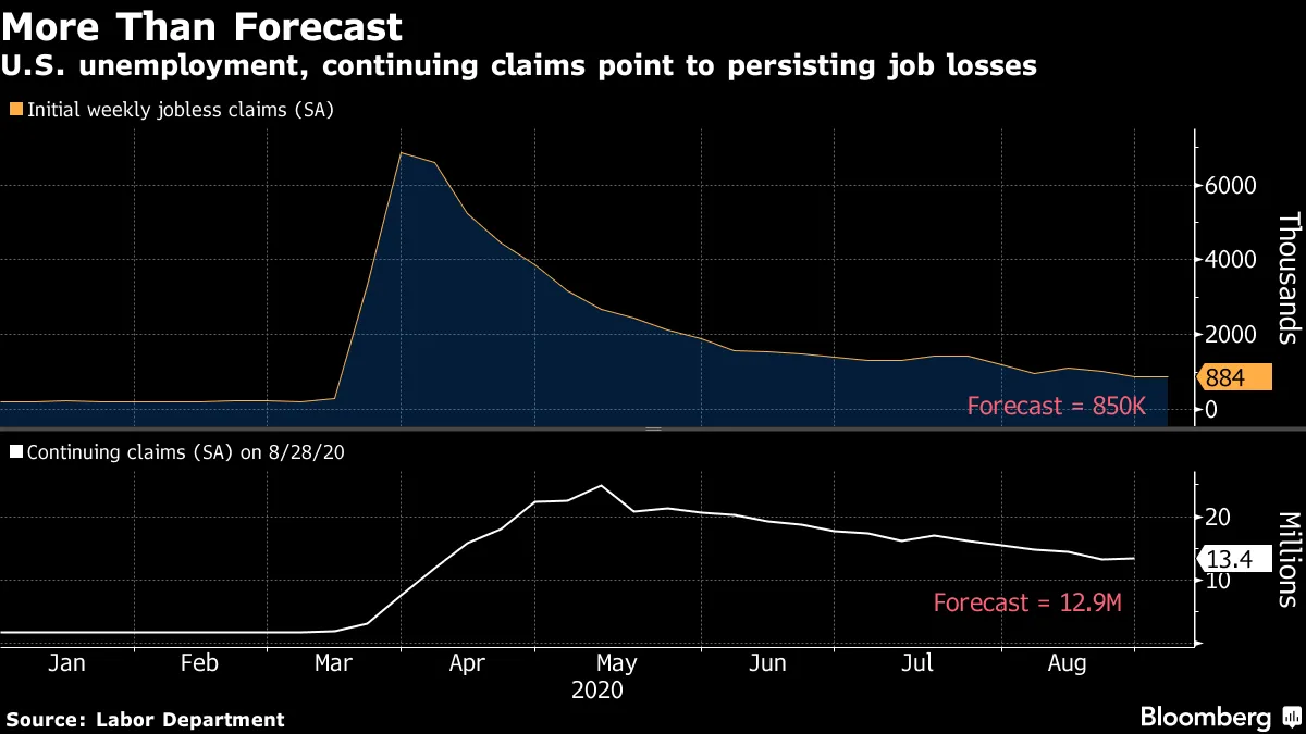 美国州失业救济申请上周保持稳定,表明大规模失业仍在持续,因为国家在努力控制新冠病毒。截止到8月29日的一周,申请持续失业救济的美国人总数增加了93,000人,达到1340万人。