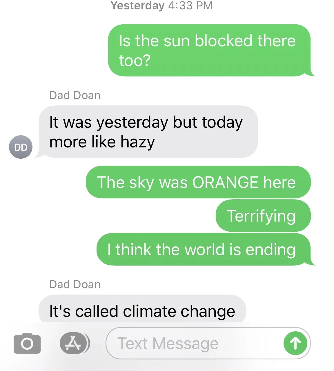 然后还有一种悄然渗透进我窗户的情况:烟雾浓厚,吞噬了阳光,在我位于奥克兰的家中投下病态的橙色阴影,让我的女儿索非亚疑惑为什么早上8:30外面是黑暗的。