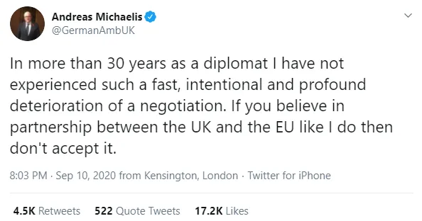 违约的概念 让欧盟和约翰逊自己保守党成员感到震惊——甚至是像前领导人 迈克尔·霍华德。德国驻英国大使对此有特别尖锐的 回应。