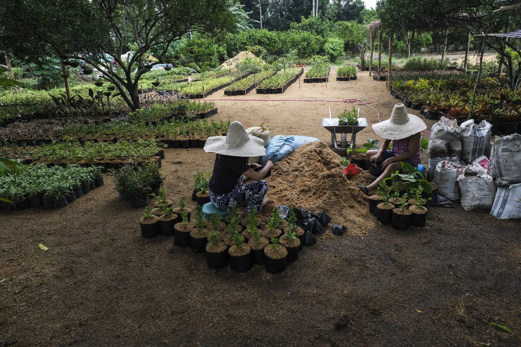 工人在菲律宾巴坦加斯省的一家注册苗圃中重新栽种植物,时间是9月12日。