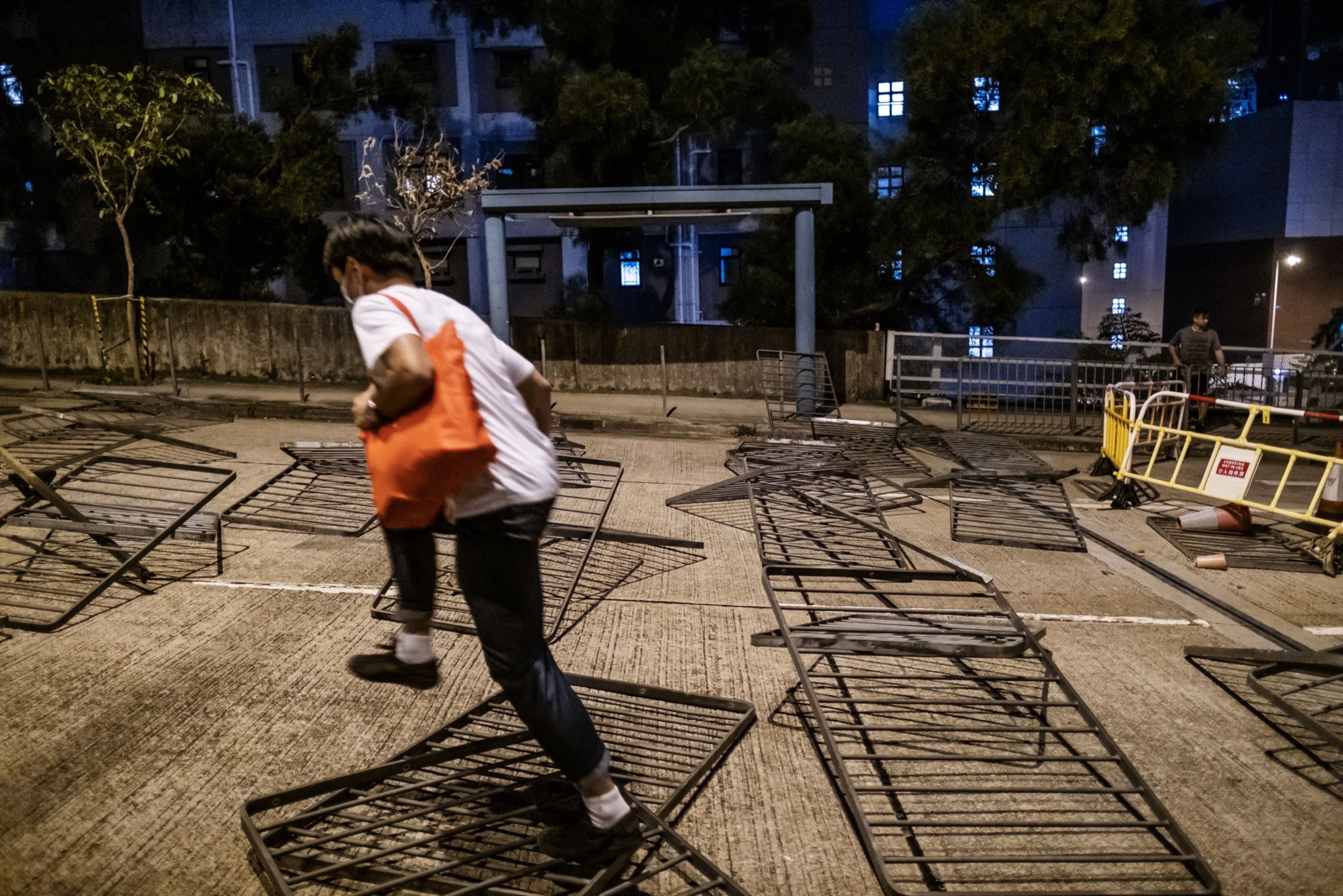 一名行人在2019年11月香港城市大学学生宿舍附近的抗议活动中穿过路障。