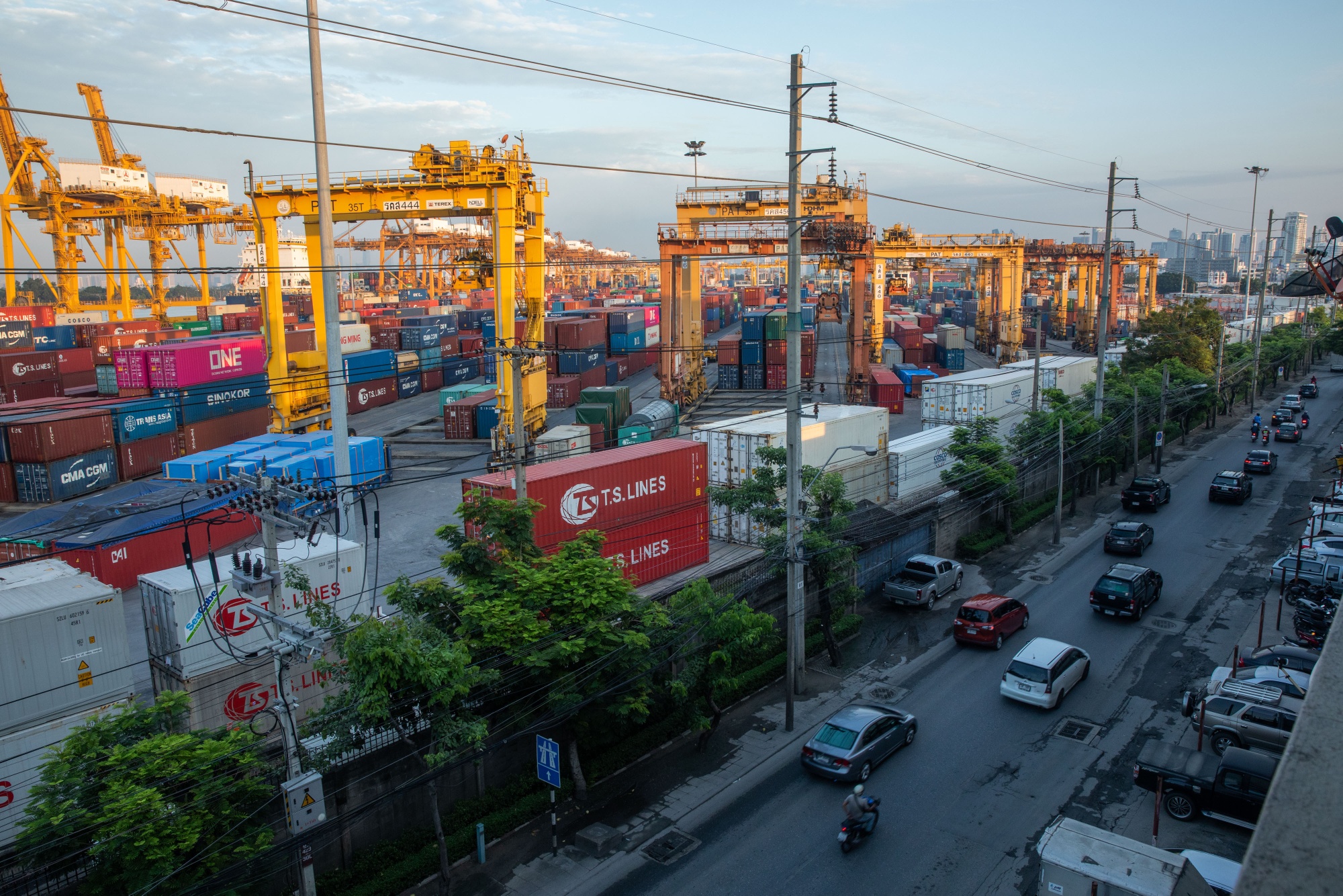 车辆在泰国曼谷港的集装箱和龙门吊旁经过,时间是2020年9月2日,星期三。