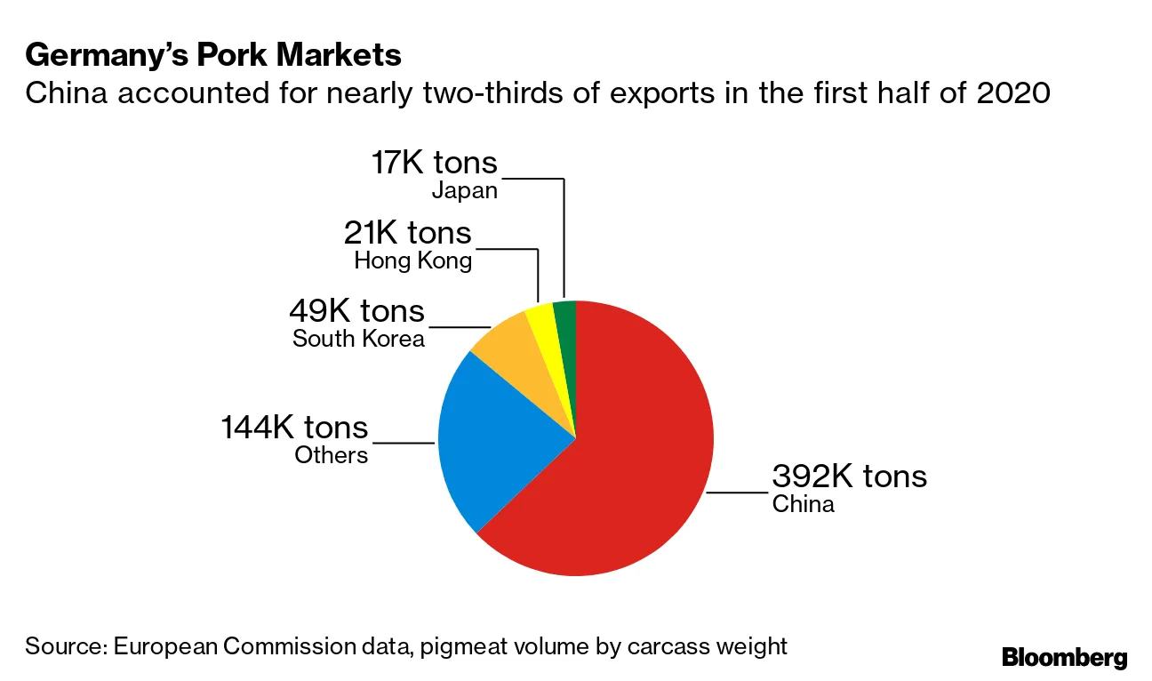 中国已暂停从德国进口猪肉,并将销毁现有供应,以应对一种杀猪疾病的担忧。德国几乎依赖中国出口其三分之二的猪肉,确认上周出现了非洲猪瘟病例。这导致韩国和日本暂停采购,台湾开始检查来自该欧洲国家的乘客行李。疫情给美国的养殖农民带来了提振,他们因新冠疫情而受到冲击,导致肉类加工厂关闭。