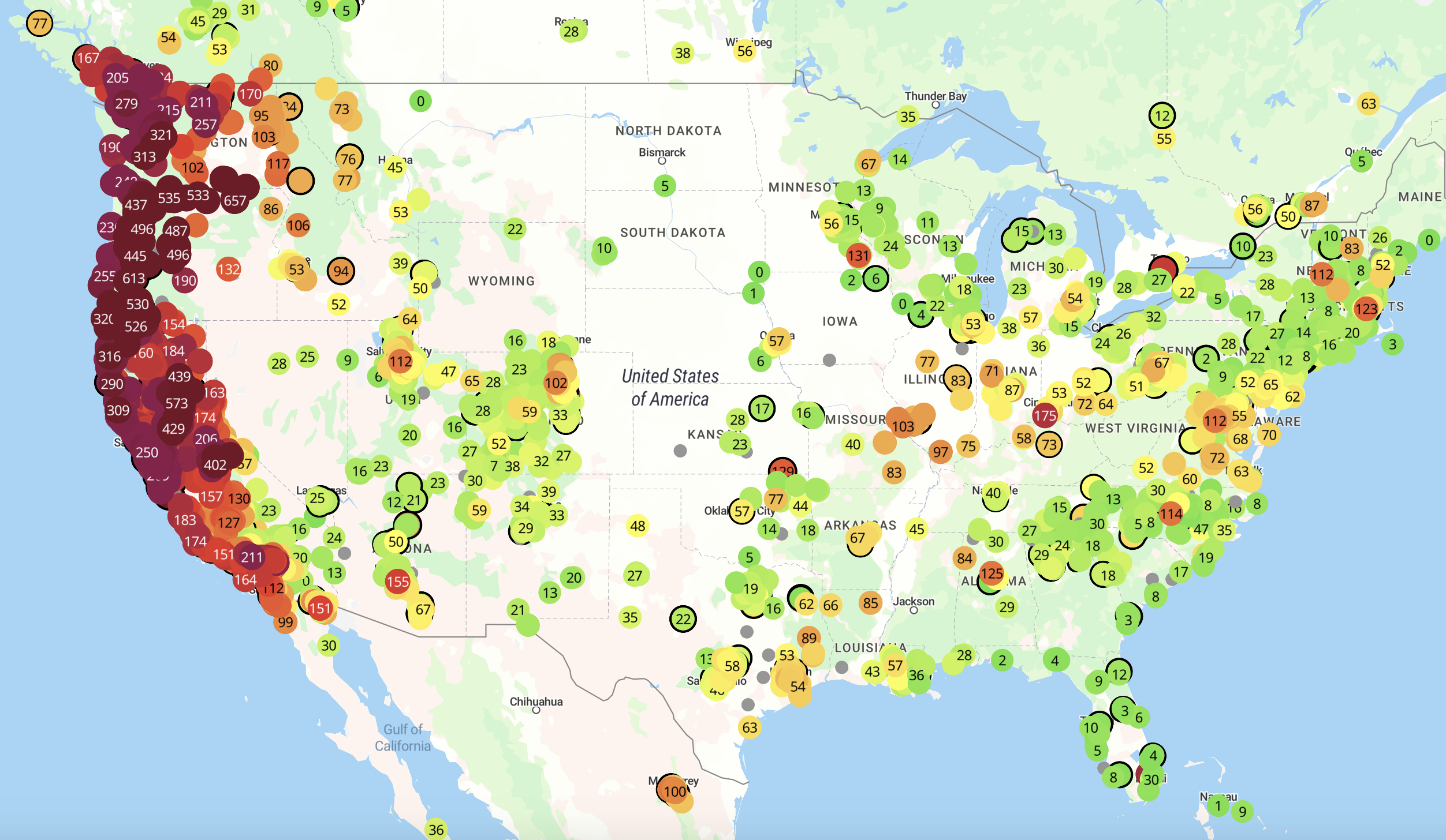 2020年9月11日的PurpleAir地图截图显示了加利福尼亚、俄勒冈州和华盛顿州野火烟雾的影响。