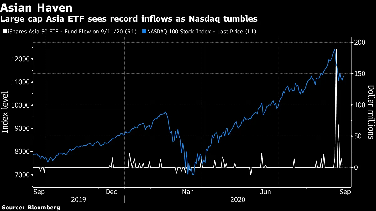 亚洲科技投资者应该能稍微安心一些,不必担心纳斯达克100的夜间波动。近期以科技为主的美国基准指数的抛售与对亚洲股票的需求激增恰逢其时,尤其是大型和流动性强的科技股。本月流入亚太跟踪基金的净流入主要由创纪录的2.86亿美元注入iShares Asia 50 ETF主导,该ETF跟踪香港、韩国、台湾和新加坡最大、最具流动性的股票指数。最大流入发生在9月3日和9月8日,即美国科技股近期抛售的高峰期。
