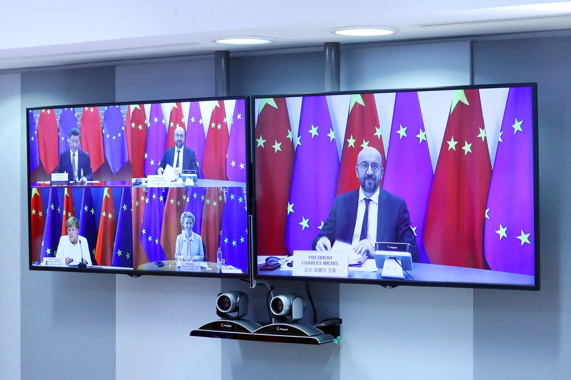 欧洲理事会主席查尔斯·米歇尔、欧洲委员会主席乌尔苏拉·冯·德·莱恩、默克尔和习近平在昨天布鲁塞尔的虚拟峰会期间。摄影师:伊夫·赫尔曼/法新社告诉我们我们做得如何或我们缺少什么,联系 [email protected]*。*