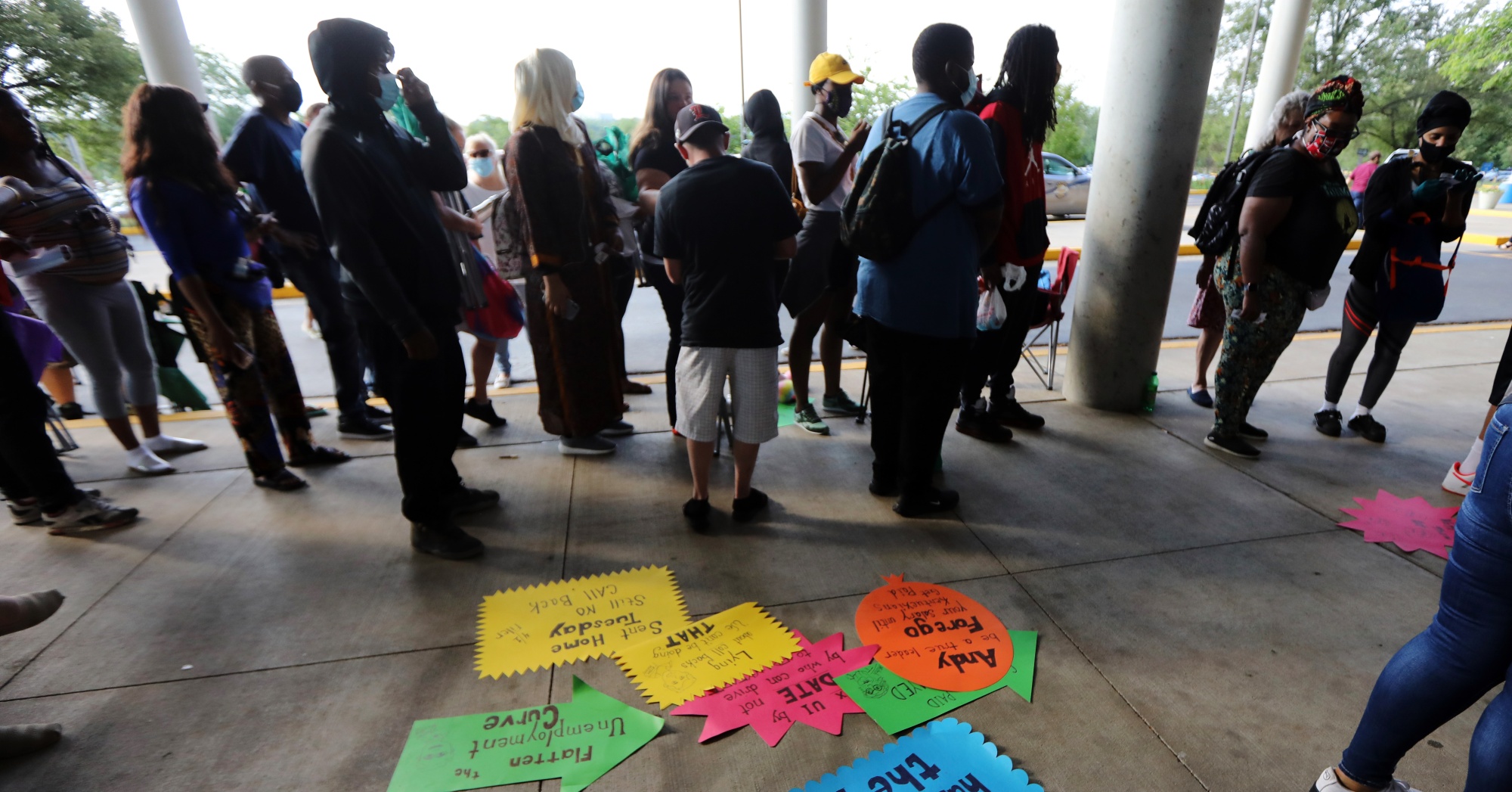 数百名失业的肯塔基州居民在6月19日排队等候在肯塔基职业中心外。