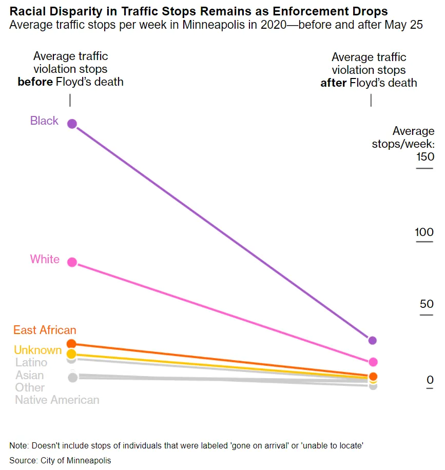 明尼阿波利斯警方自乔治·弗洛伊德于5月去世以来,交通拦截减少了80%,彭博城市实验室报道。