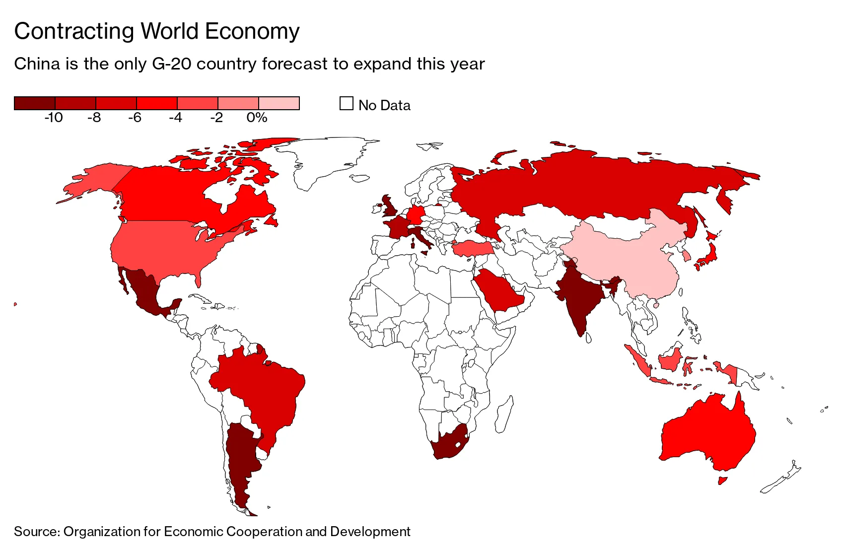 根据经济合作与发展组织(OECD)的说法,全球经济衰退今年不会像之前担心的那样剧烈,尽管复苏的步伐正在减缓,并且在一段时间内仍需要政府和中央银行的支持。全球经济今年将萎缩4.5%,低于6月预测的6%,巴黎的机构表示,中国是唯一一个温和增长的20国集团国家。