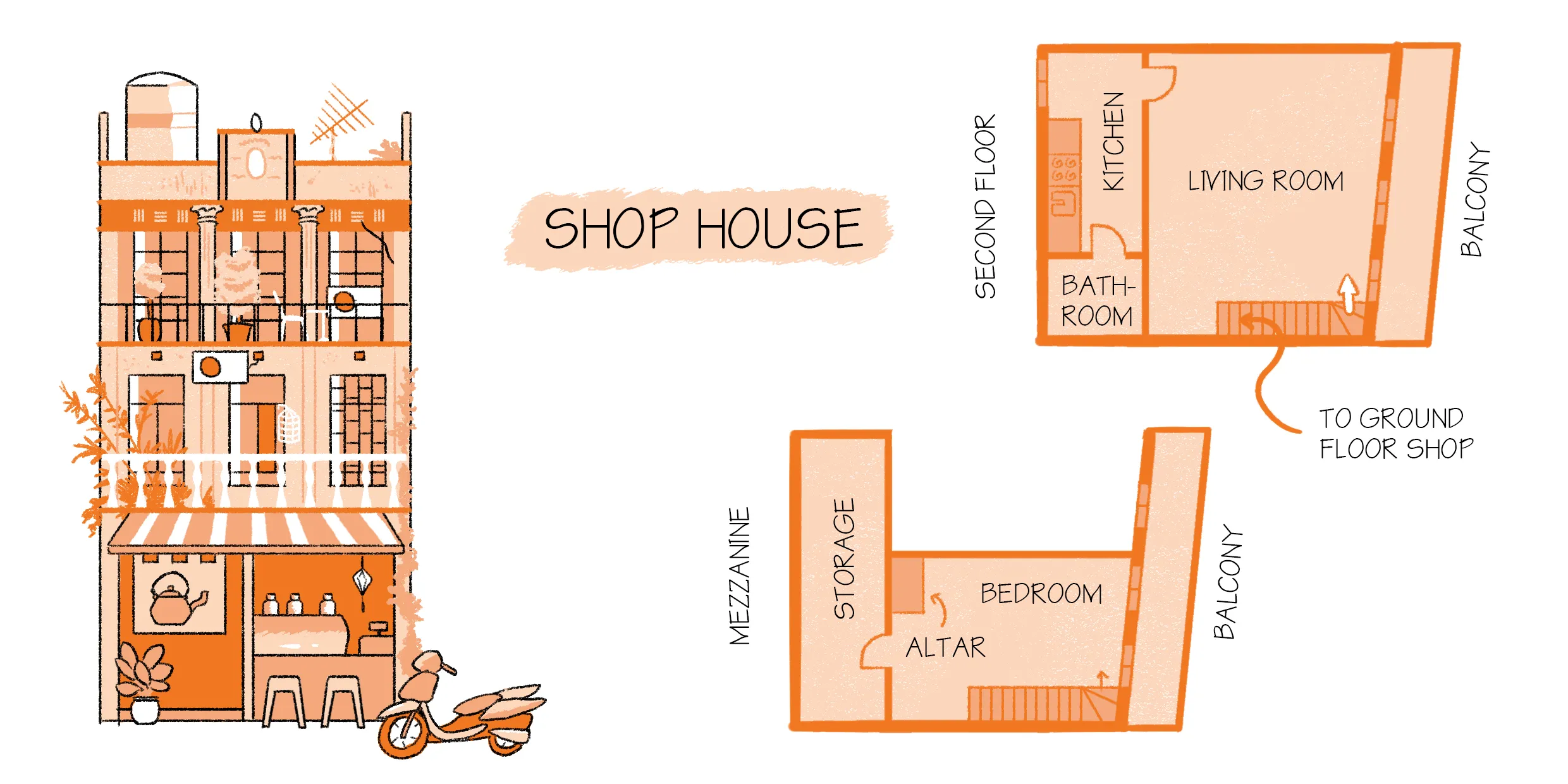 该物业俯瞰着一条街道,街上戴着斗笠的老年妇女从推车上出售荔枝和家居用品,平面图大致符合其他管式房屋的典型布局。茶馆占据了与手机配件店、行李店和另一家咖啡馆共享的两层楼。然后是住宅楼层。茶馆正上方是业主的厨房、浴室和客厅。夹层有一张床,屋檐下有存储空间用于茶馆的桌椅——还有一个祭祖的祭坛。房间不大,但每层都有一个阴凉的阳台,可以俯瞰街道,提供额外的户外空间。