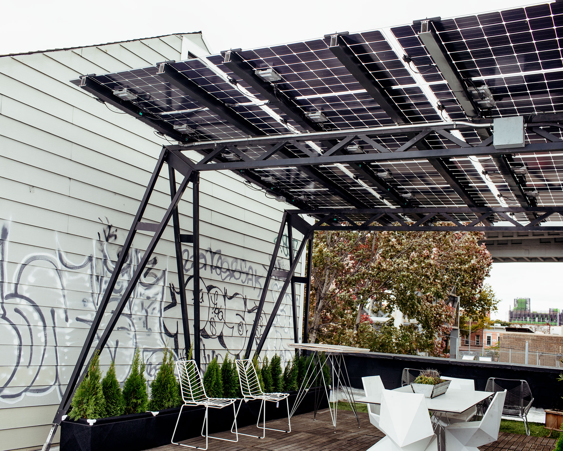 “我们意识到,如果我们将太阳能抬高到平屋顶上方9英尺,你可以在上面放置更多的面板。” — 布鲁克林太阳能工作室的路德维希