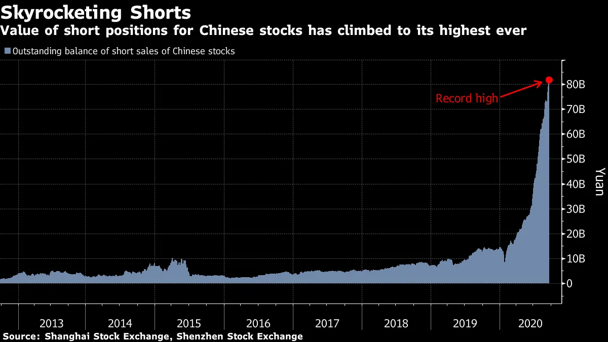 在中国,正如我的同事Molly Dai的这张图表所示,空头头寸(在股票价格下跌时获利的头寸)的价值已攀升至历史最高水平。