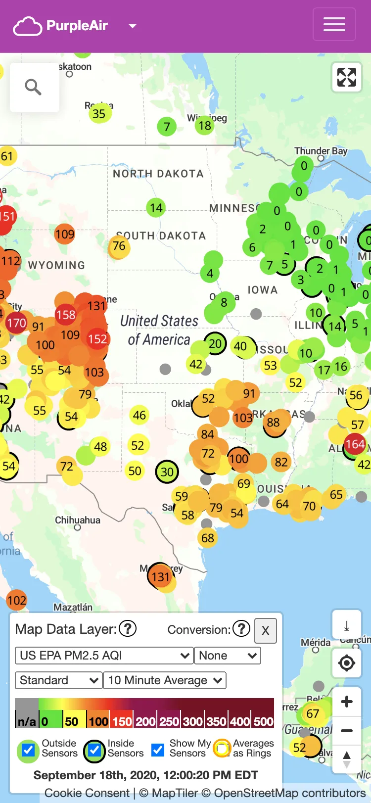 “空气质量本身吸引了人们来我们这里。这个月我们网站上有数百万用户在查看地图,”Dybwad说。Purple Air传感器提供细颗粒物的实时测量——这些更小、更危险的颗粒会深入肺部,造成更大的长期健康损害。