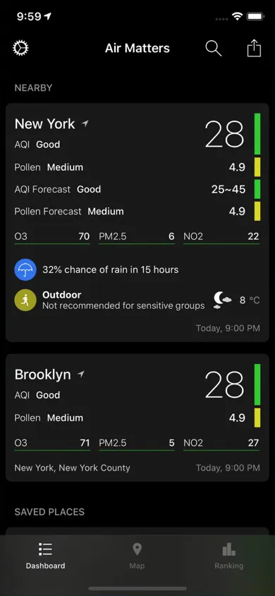 来源:Air Matters2. Air Matters 于2011年推出,最初作为中国空气质量指数(2016年重新品牌)。该工具在中国和印度被广泛使用。它提供全球实时空气质量预测,包括多个美国城市的预测,以及排名和5天的预测能力。