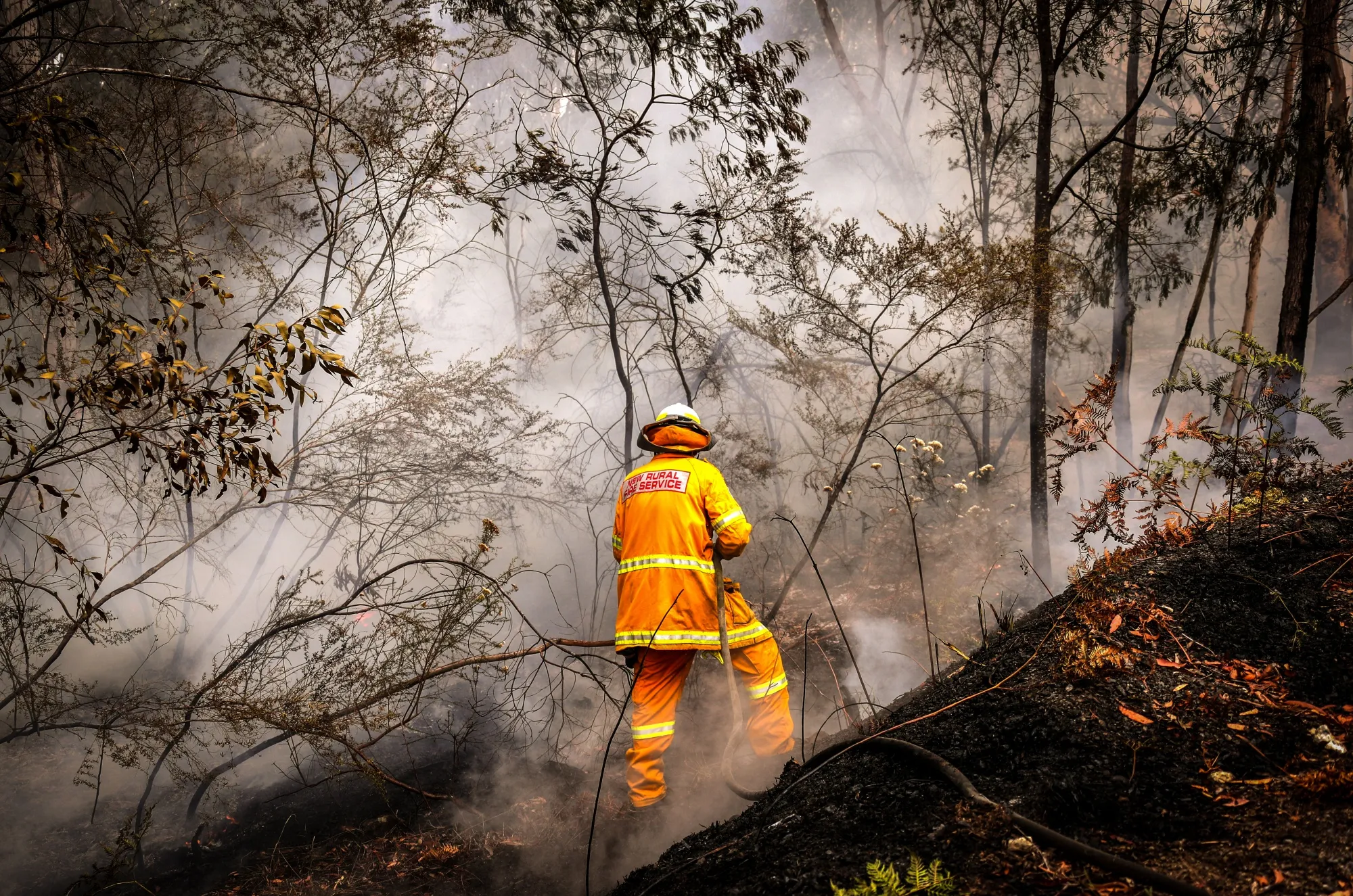 新南威尔士州农村消防服务的志愿者在2019年12月在澳大利亚库尔努拉镇附近进行回烧作业时扑灭火焰。