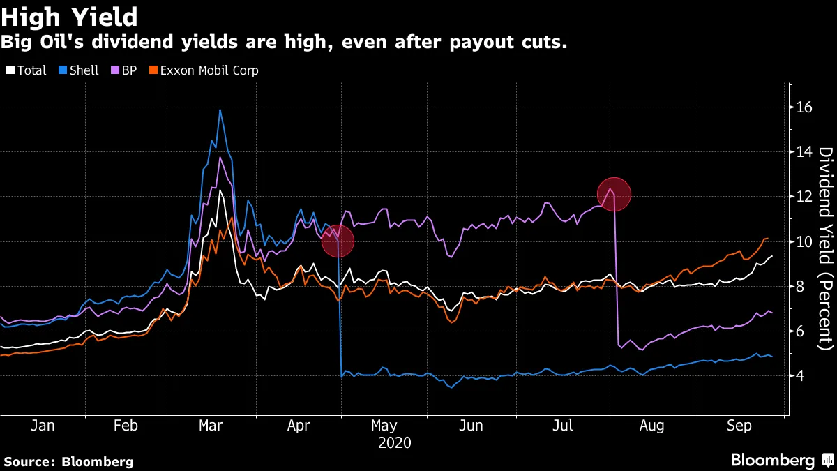 关于大型石油公司在世界逐渐远离化石燃料时维持回报能力的怀疑反映在公司的股息收益率上。BP和壳牌的股息收益率稳步上升,这表明股东对即使在今年早些时候大幅削减后,股息能否维持并不自信。