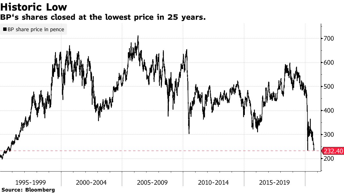 就在公布将自己转变为清洁能源巨头的计划一周后,BP公司的股价跌至25年来的最低点。