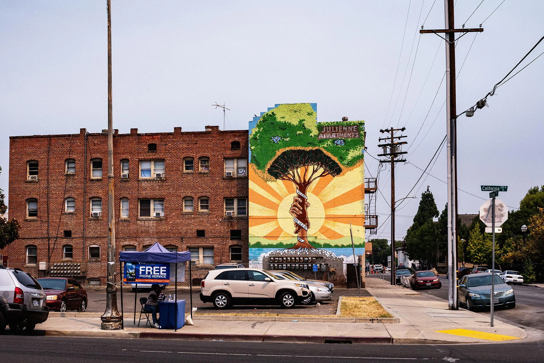 斯托克顿市中心的三幅SEED壁画之一。摄影师:安德里·坦布南为《彭博商业周刊》拍摄 作为一代人中第一个实验基本收入的美国城市,斯托克顿是一个非常合适的选择。这个位于加利福尼亚中央谷地、沿圣华金河的中等规模大都市,人口约30万,成立于淘金热时期,以一位海军准将的名字命名,早已成为美国最具多样性的城市之一。但多样性并不意味着平等。跨城高速公路将主要是白人和更富裕的北部与以西班牙裔、亚洲裔和黑人为主的南部隔开,后者因红线政策、投资不足和激进的警务造成了持久的伤害。南部的预期寿命低了八年,气温高了三度。2007年,没有哪个城市的止赎率比斯托克顿更高;五年后,它成为第一个 宣布破产的主要美国城市。
