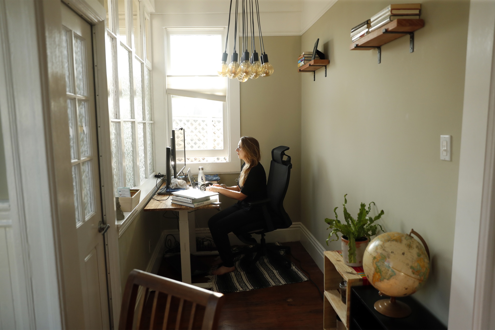 阿莉·西林斯在旧金山的家中工作。湾区的都市交通委员会提出了一项远程工作目标,要求以办公室为基础的雇主让60%的员工远程办公。