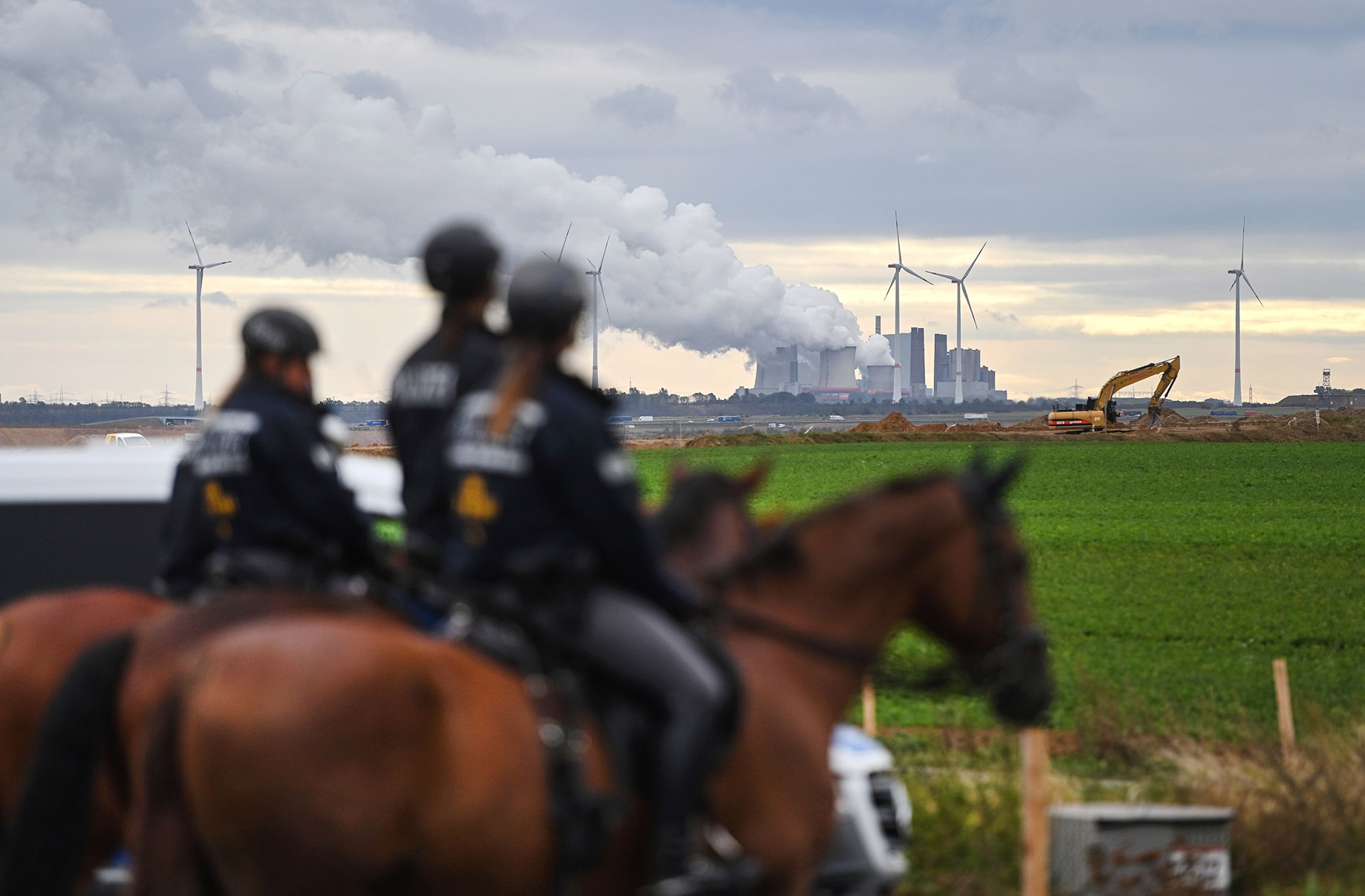 骑马的警察在9月25日朝着Neurath的燃煤电厂望去。
