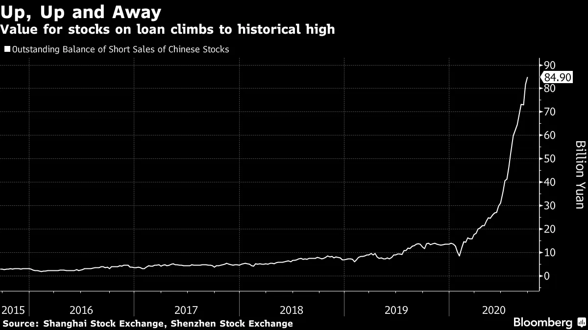 来自中国股市的谨慎信号也在增加,因为卖空股票的价值达到了创纪录的高位。交易员们将国内交易所的证券借贷余额推高至849亿元人民币,截止到9月25日的一周。你可以在图表中看到最近的增长。