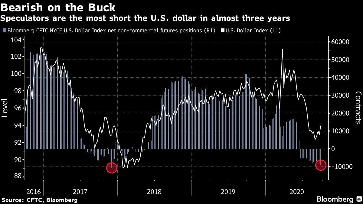 新一波冠状病毒感染、美国财政刺激停滞以及对11月3日总统选举将如何展开的不确定性都伤害了市场情绪。然而,尽管面临这样的严峻背景,最新的对冲基金头寸数据显示,投机者在近三年来首次积累了对美元的最大做空押注。